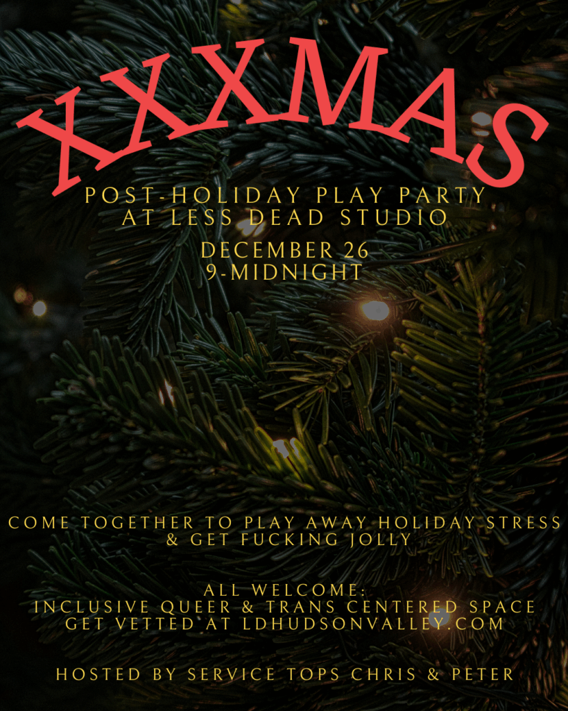 Join us on Halloween Night, the Friday after Thanksgiving and the Friday just after Christmas! Warmly hosted by Chris Maxwell Rose of Pleasure Mechanics and Service Top Peter, these play parties are open to all vetted Less Dead community.